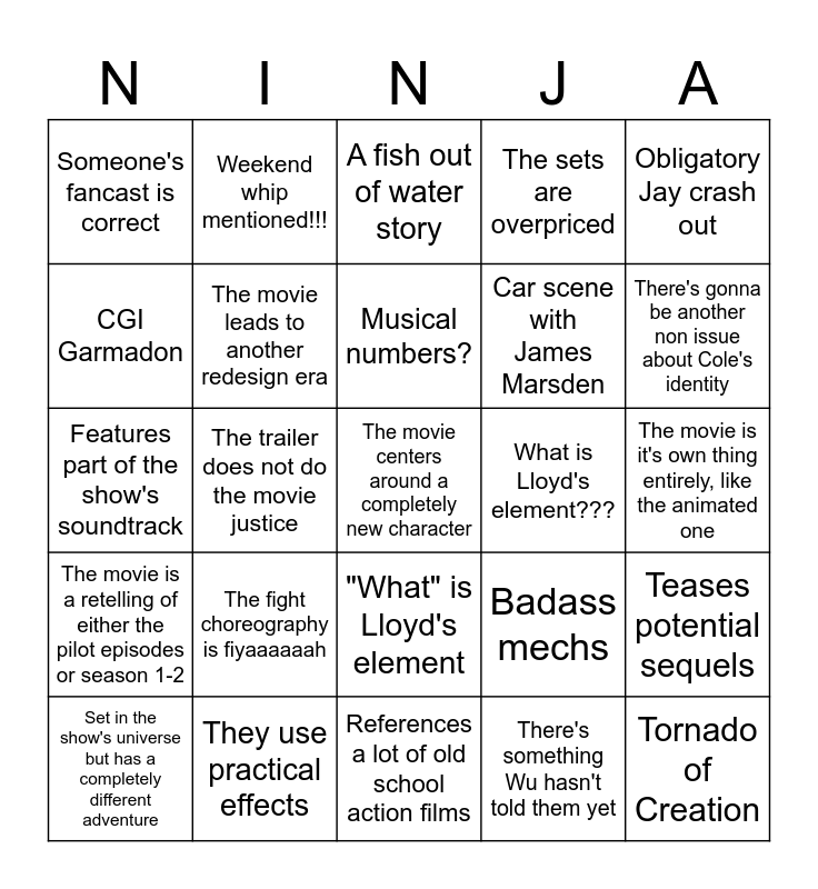This bingo card has 30 words: They use practical effects, Something something find "X" blade, The trailer does not do the movie justice, It actually features an all asian cast!!!, Someone's fancast is correct, A fish out of water story, The movie leads to another redesign era, "What" is Lloyd's element, What is Lloyd's element???, References a lot of old school action films, The movie is it's own thing entirely, like the animated one, The movie centers around a completely new character, There's something Wu hasn't told them yet, Tornado of Creation, There's gonna be another non issue about Cole's identity, The spinjitzu actually looks pretty cool, Badass mechs, The movie is a retelling of either the pilot episodes or season 1-2, The fight choreography is fiyaaaaaah, Obligatory Jay crash out, Features part of the show's soundtrack, Zane is actually portrayed as someone with human emotions, Weekend whip mentioned!!!, Car scene with James Marsden, CGI Garmadon, The sets are overpriced, Teases potential sequels, Set in the show's universe but has a completely different adventure, Musical numbers? and The costumes are actually well made.