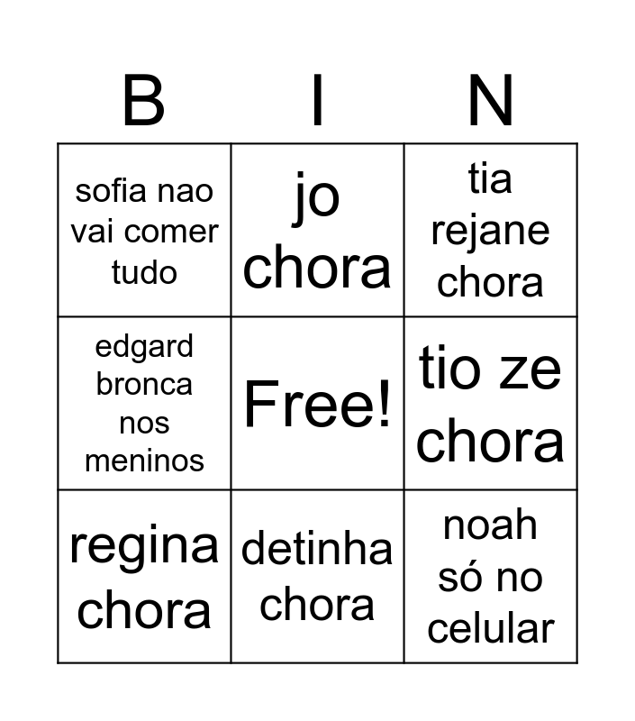This bingo card has a free space and 8 words: tio ze chora, tia rejane chora, jo chora, regina chora, sofia nao vai comer tudo, noah só no celular, edgard bronca nos meninos and detinha chora.