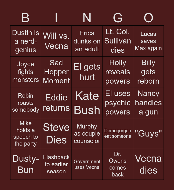 This bingo card has 29 words: Dusty-Bun, Jonathan and Steve fight, Eddie returns, Vecna dies, Dustin is a nerd-genius, Erica dunks on an adult, Sad Hopper Moment, Steve Dies, El uses psychic powers, Flashback to earlier season, Nancy handles a gun, Kate Bush, Government uses Vecna, Dr. Owens comes back, Billy gets reborn, Will touches his neck, Murphy as couple counselor, Mike holds a speech to the party, Lucas saves Max again, Robin roasts somebody, Demogorgon eat someone, Steve & Nancy chemistry, Holly reveals powers, Joyce fights monsters, Lt. Col. Sullivan dies, Will vs. Vecna, "Guys", El gets hurt and Group hugging.