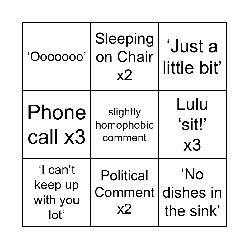 This bingo card has 9 words: ‘I can’t keep up with you lot‘, ‘Just a little bit’, Sleeping on Chair x2, Phone call x3, ‘Ooooooo’, Lulu ‘sit!’ x3, slightly homophobic comment, ‘No dishes in the sink’ and Political Comment x2.