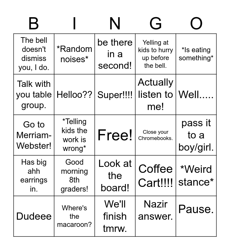 This bingo card has a free space and 24 words: Good morning 8th graders!, Where's the macaroon?, Super!!!!, Dudeee, *Is eating something*, The bell doesn't dismiss you, I do., Talk with you table group., *Random noises*, Close your Chromebooks., Look at the board!, Actually listen to me!, Go to Merriam-Webster!, Coffee Cart!!!!, *Weird stance*, Helloo??, Nazir answer., pass it to a boy/girl., be there in a second!, Well....., *Telling kids the work is wrong*, Pause., Has big ahh earrings in., Yelling at kids to hurry up before the bell. and We'll finish tmrw..