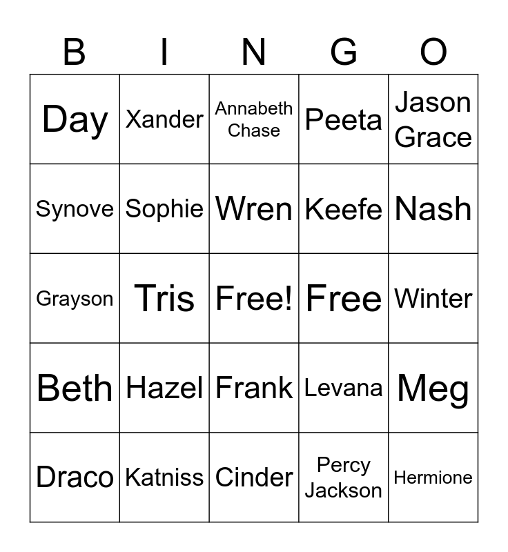 This bingo card has a free space and 45 words: Harry Potter, Hermione, Ron, Draco, Dobby, Percy Jackson, Annabeth Chase, Grover, Jason Grace, Katniss, Peeta, Free, Frank, Hazel, Piper, Cinder, Avery, Grayson, Jameson, Nash, Xander, Prudence, Jude, Day, June, Winter, Cress, Scarlet, Levana, Beth, Jo, Meg, Amy, Laurie, Jest, Tris, Ten, Kazi, Jase, Wren, Synove, Keefe, Fitz, Sophie and Dex.