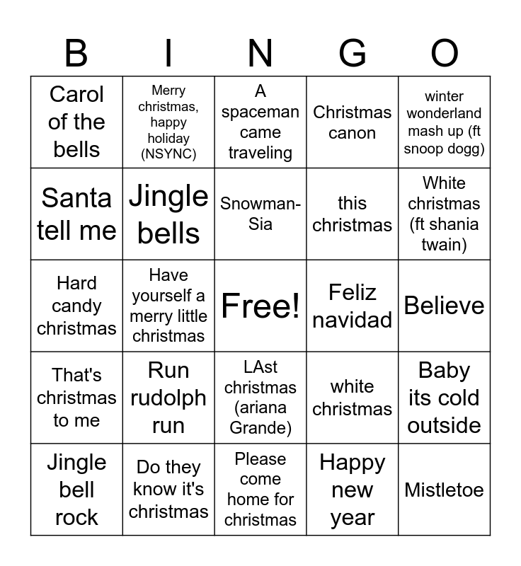 This bingo card has a free space and 47 words: Last christmas, Mistletoe, Fairytale of NY, Please come home for christmas, Run rudolph run, Thank god its christmas, Merry christmas, happy holiday (NSYNC), God rest ye merry gentlemen, Santa tell me, Oh Santa!, Jingle bells, Christmas canon, Baby its cold outside, white christmas, the trouble with love is, Driving home for christmas, Snowman-Sia, Feliz navidad, White winter hymnal (pentatonix), winter wonderland mash up (ft snoop dogg), Have yourself a merry little christmas, Happy new year, Carol of the bells, this christmas, Santa, Can't you hear me, White christmas (ft shania twain), Jingle bell rock, Christmas wrapping, LAst christmas (ariana Grande), That's christmas to me, All I want for christmas is you, Baby, It's cold outside (dean martin), Rudolph the red nose reindeer, Wonderful christmas time, Christmas (baby come home), Do they know it's christmas, Believe, Santa baby (ariana Grande), December, Santa claus is coming to town (Mariah Carey), Cool Yule, A spaceman came traveling, Hard candy christmas, December (earth wind and fire), A nonsense christmas, Holly jolly christmas and Hallelujah.