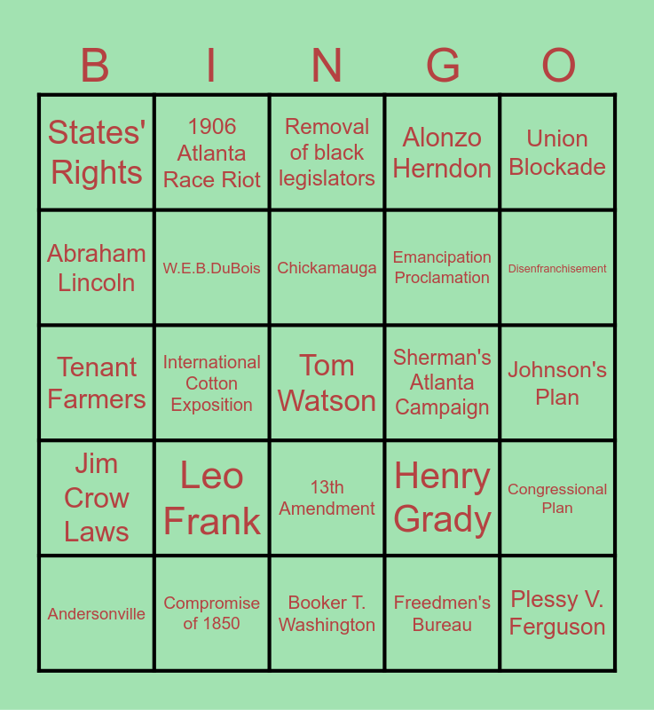 This bingo card has a free space and 24 words: Leo Frank, Compromise of 1850, Chickamauga, Andersonville, Union Blockade, States' Rights, Abraham Lincoln, 1906 Atlanta Race Riot, Sherman's Atlanta Campaign, 13th Amendment, Emancipation Proclamation, Tenant Farmers, Henry Grady, Congressional Plan, W.E.B.DuBois, Freedmen's Bureau, Johnson's Plan, Removal of black legislators, Disenfranchisement, International Cotton Exposition, Plessy V. Ferguson, Jim Crow Laws, Alonzo Herndon and Booker T. Washington.