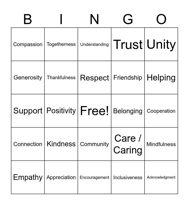 This bingo card has a free space and 24 words: Kindness, Appreciation, Respect, Empathy, Unity, Compassion, Generosity, Togetherness, Belonging, Community, Friendship, Support, Care / Caring, Mindfulness, Thankfulness, Inclusiveness, Cooperation, Understanding, Helping, Positivity, Acknowledgment, Connection, Trust and Encouragement.