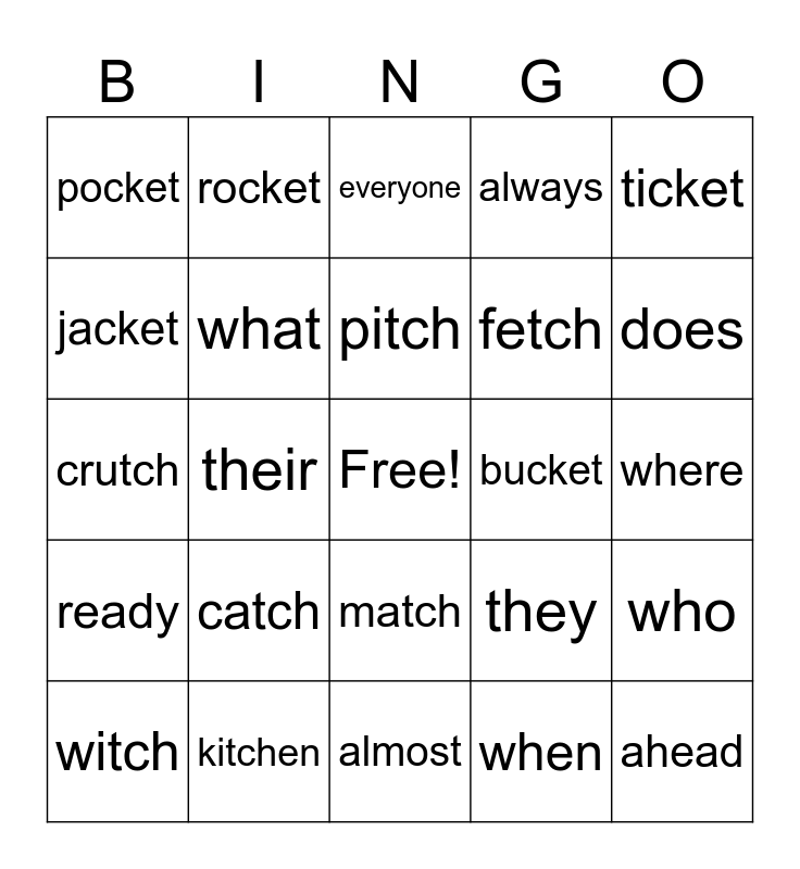 This bingo card has a free space and 24 words: catch, kitchen, pitch, witch, ticket, pocket, jacket, rocket, bucket, match, fetch, crutch, they, who, what, when, where, everyone, does, their, ahead, ready, always and almost.