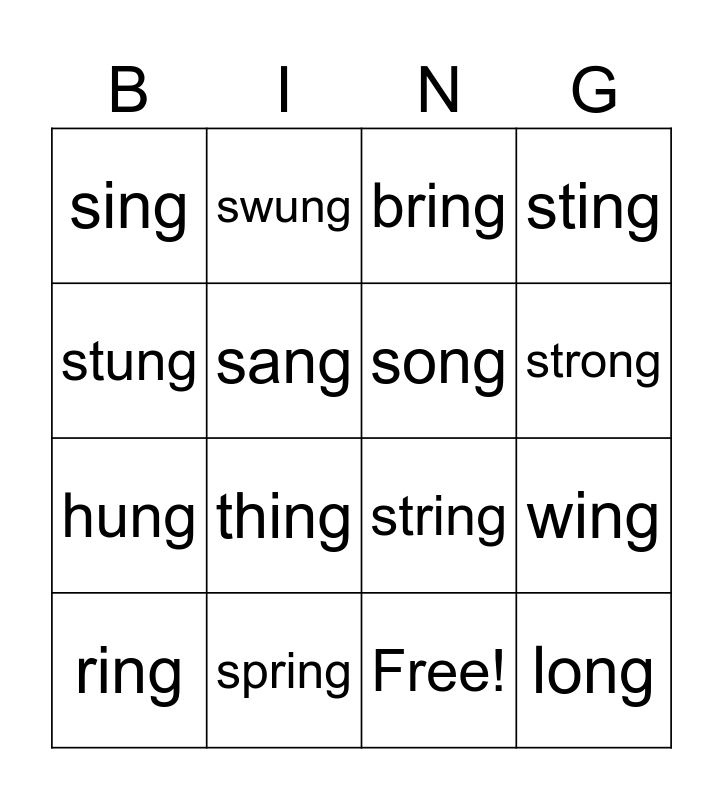 This bingo card has 17 words: Free!, ring, bring, sing, thing, sting, wing, song, strong, sang, spring, string, stung, swung, hung, flung and long.