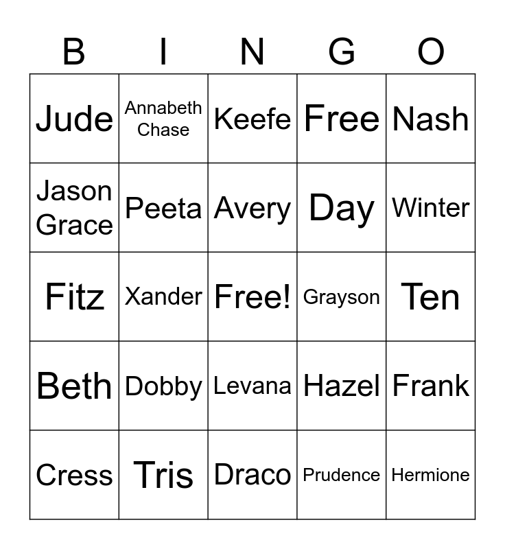 This bingo card has a free space and 47 words: Harry Potter, Hermione, Ron, Draco, Dobby, Percy Jackson, Annabeth Chase, Grover, Jason Grace, Katniss, Peeta, Free, Frank, Hazel, Piper, Cinder, Avery, Grayson, Jameson, Nash, Xander, Prudence, Jude, Day, June, Winter, Cress, Scarlet, Levana, Beth, Jo, Meg, Amy, Laurie, Jest, Tris, Ten, Kazi, Jase, Wren, Synove, Keefe, Fitz, Sophie, Dex, Gale and Cath.