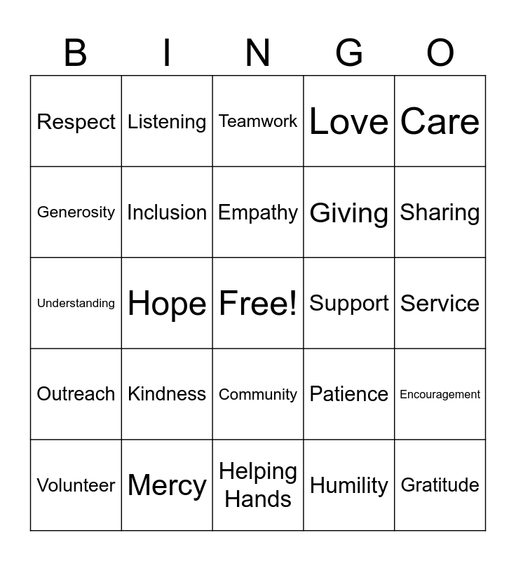 This bingo card has a free space and 25 words: Kindness, Helping Hands, Empathy, Volunteer, Care, Respect, Generosity, Listening, Support, Community, Giving, Understanding, Patience, Encouragement, Inclusion, Compassion, Service, Teamwork, Sharing, Hope, Gratitude, Mercy, Outreach, Love and Humility.