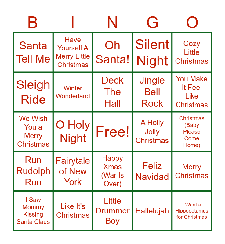 This bingo card has a free space and 53 words: Last Christmas, I Want a Hippopotamus for Christmas, Wonderful Christmastime, Hallelujah, Fairytale of New York, All I Want for Christmas Is You, Have Yourself A Merry Little Christmas, Rudolph the Red-Nosed Reindeer, Sleigh Ride, A Nonsense Christmas, Winter Wonderland, Carol of the Bells, Merry Christmas, Feliz Navidad, Mele Kalikimaka, I Saw Mommy Kissing Santa Claus, Deck The Hall, A Holly Jolly Christmas, Mistletoe, Cozy Little Christmas, O Holy Night, Snowman, Jingle Bell Rock, Santa Tell Me, Here Comes Santa Claus (Right Down Santa Claus Lane), Like It's Christmas, Frosty The Snowman, Blue Christmas, Santa Claus Is Coming To Town, You Make It Feel Like Christmas, My Only Wish (This Year), Christmas In Hollis, Underneath the Tree, Baby, It's Cold Outside, White Christmas, Rockin' Around The Christmas Tree, Silent Night, Little Drummer Boy, Oh Santa!, Joy To The World, I'll Be Home For Christmas, Star of Christmas, Christmas (Baby Please Come Home), Merry Christmas, Happy Holidays, Jingle Bells, Happy Xmas (War Is Over), Silver Bells, Let It Snow! Let It Snow! Let It Snow!, We Wish You a Merry Christmas, Run Rudolph Run, You're A Mean One, Mr. Grinch, Santa Baby and Christmas Tree Farm.