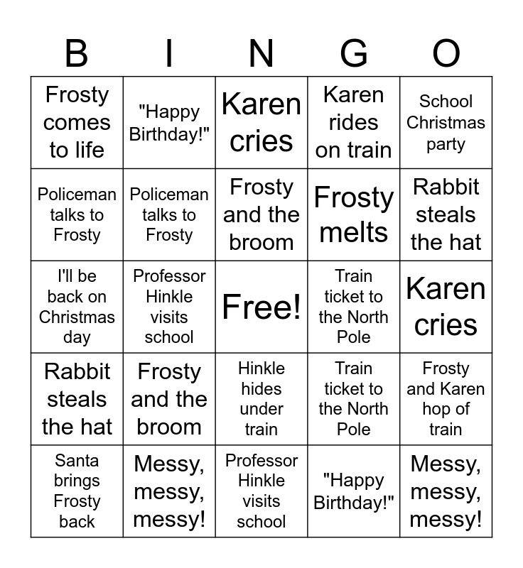 ⚠ This card has duplicate items: Frosty comes to life (6), "Happy Birthday!" (3), Professor Hinkle visits school (3), Kids build Frosty (3), Frosty leads parade (3), Policeman talks to Frosty (3), Karen rides on train (3), Hinkle hides under train (3), Frosty melts (3), Karen rides Frosty (3), Santa brings Frosty back (3), Frosty can't count (3), Rabbit steals the hat (3), Rabbit tells Santa Karen is in trouble (3), I'll be back on Christmas day (3), Train ticket to the North Pole (3), School Christmas party (3), Frosty and Karen in greenhouse (3), Karen cries (3), Frosty and the broom (3), Messy, messy, messy! (3), Frosty and Karen hop of train (3), Karen on roof of her house (3)