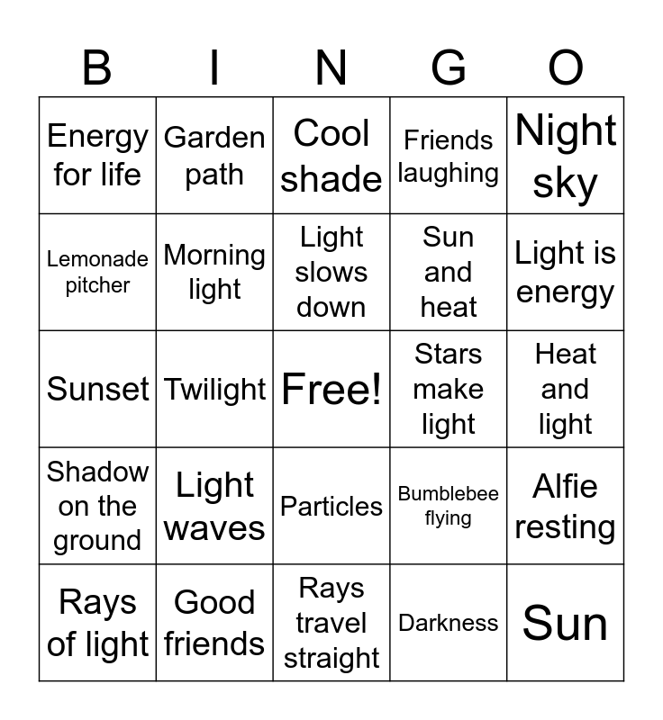 This bingo card has a free space and 49 words: Light, Sun, Light illuminates, Rays travel straight, Light waves, Shadow or shade, Garden path, Oak tree shade, Lemonade pitcher, Painting pictures, Morning light, Friends laughing, Alfie resting, Bumblebee flying, Warm sunlight, Earth’s atmosphere, Light slows down, Stars make light, Moon reflects light, Night sky, Twilight, Darkness, Energy for life, Sun and heat, Sunlight, Light is energy, Rays of light, Light waves, Particles, Shadow on the ground, Giant oak tree, Garden chairs, Ice-cold lemonade, Painting in the morning, Good friends, Alfie the dog, Buzzing bumblebee, Light travels fast, Heat and light, Blanket of air, Earth, Stars shining, Moonlight, Sunrise, Sunset, Cool shade, Darkness without light, Objects block light and Energy from the sun.