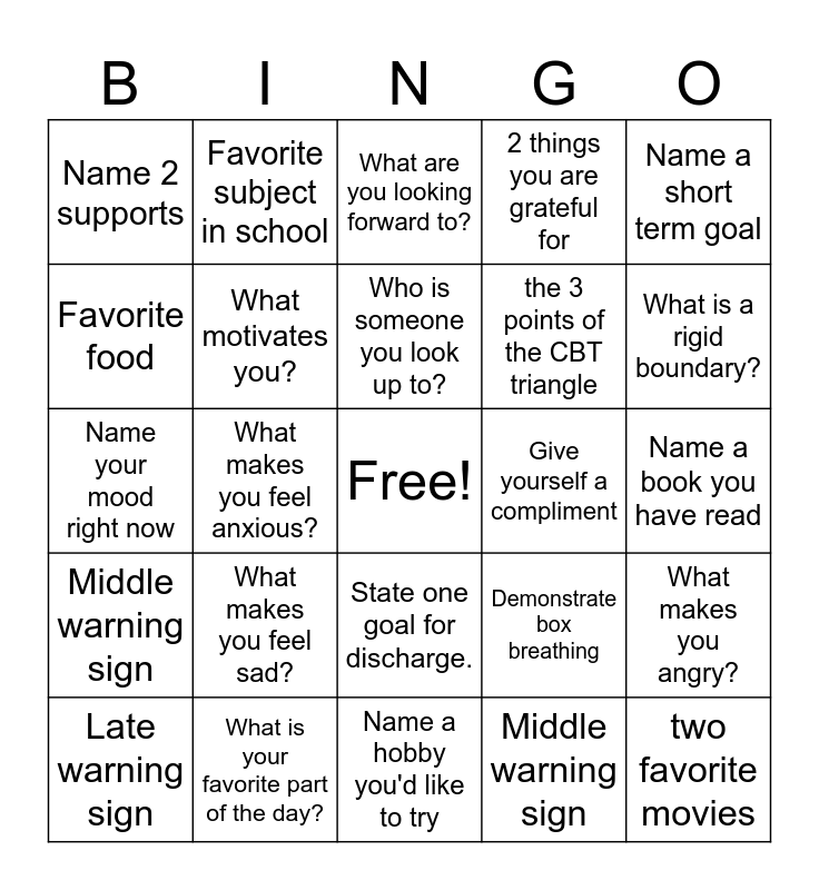 This bingo card has a free space and 34 words: Early warning sign, Middle warning sign, What is the best compliment you have received?, Name a long term goal, Middle warning sign, What motivates you?, Name a short term goal, Late warning sign, Favorite subject in school, Passive coping skill, Who is someone you look up to?, What are you looking forward to?, Active coping skill, What is a porous boundary?, Give yourself a compliment, What is a rigid boundary?, What is your favorite part of the day?, Name your mood right now, What makes you feel sad?, Demonstrate box breathing, State one goal for discharge., State one thought you think is not helpful to you., Name 2 supports, Name a book you have read, Name a hobby you'd like to try, two favorite movies, 2 things you are grateful for, Demonstrate 2 stretches you can do to calm down., the 3 points of the CBT triangle, Favorite food, What is something you'd like to learn more about?, What makes you feel anxious?, What makes you angry? and Name one of your favorite songs/artists.
