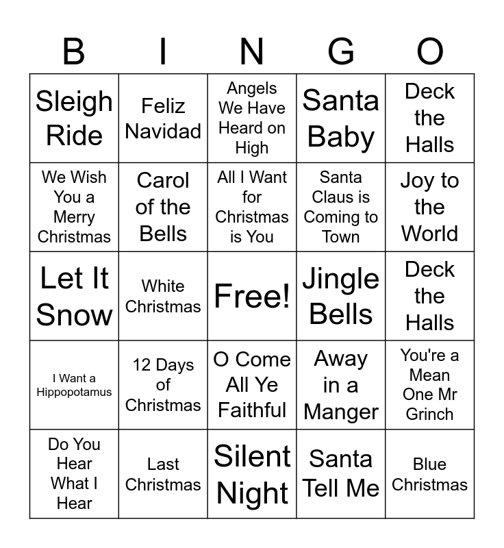 This bingo card has a free space and 34 words: It's Beginning to Look a Lot Like Christmas, Santa Tell Me, Mistletoe, Winter Wonderland, I Want a Hippopotamus, Carol of the Bells, Deck the Halls, Do You Hear What I Hear, Feliz Navidad, Frosty the Snowman, All I Want for Christmas is You, Angels We Have Heard on High, It Came upon a Midnight Clear, Jingle Bell Rock, Jingle Bells, Joy to the World, Last Christmas, Let It Snow, 12 Days of Christmas, Away in a Manger, O Come All Ye Faithful, Rudolph the Red Nosed Reindeer, Sleigh Ride, Deck the Halls, Silent Night, Blue Christmas, Santa Baby, The Christmas Song, Santa Claus is Coming to Town, We Wish You a Merry Christmas, Where Are You Christmas, White Christmas, You're a Mean One Mr Grinch and Dance of the Sugar Plum Fairy.