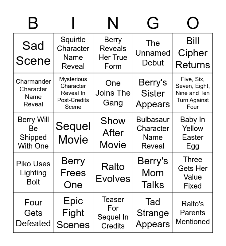 This bingo card has a free space and 24 words: Berry Frees One, Epic Fight Scenes, One Joins The Gang, Four Gets Defeated, Bill Cipher Returns, Sad Scene, Charmander Character Name Reveal, Squirtle Character Name Reveal, Bulbasaur Character Name Reveal, Ralto Evolves, Berry's Sister Appears, Berry Will Be Shipped With One, Berry's Mom Talks, Three Gets Her Value Fixed, Mysterious Character Reveal In Post-Credits Scene, Tad Strange Appears, Baby In Yellow Easter Egg, Berry Reveals Her True Form, Five, Six, Seven, Eight, Nine and Ten Turn Against Four, Sequel Movie, Ralto's Parents Mentioned, Piko Uses Lighting Bolt, The Unnamed Debut and Teaser For Sequel In Credits.