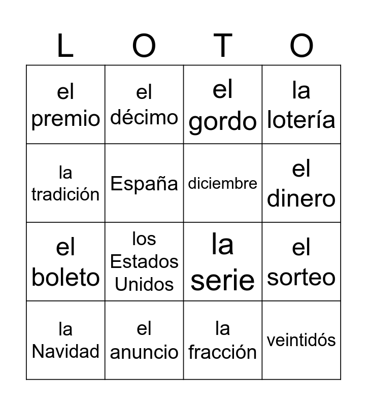 This bingo card has 16 words: el anuncio, el sorteo, el gordo, el premio, el boleto, el décimo, la serie, la fracción, la tradición, España, la Navidad, la lotería, los Estados Unidos, el dinero, diciembre and veintidós.