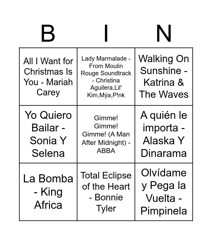 This bingo card has 75 words: Tacones Rojos - Sebastian Yatra, YMCA - Village People, Walking On Sunshine - Katrina & The Waves, Fiesta Pagana - Mägo de Oz, It's Raining Men - Geri Halliwell, Mambo No. 5 (a Little Bit of...) - Lou Bega, Salta!!! - Tequila, Para No Verte Más - La Mosca Tse-Tse, Milionària - ROSALÍA, L'Amour Toujours - Gigi D'Agostino, Cuando zarpa el amor - Camela, Believe - Cher, Total Eclipse of the Heart - Bonnie Tyler, A quién le importa - Alaska Y Dinarama, The Final Countdown - Europe, La chica yeyé - Ole Ole, Vivir Mi Vida - Marc Anthony, Blame It on the Boogie - The Jacksons, You're The One That I Want - From “Grease” - John Travolta,Olivia Newton-John, Gimme! Gimme! Gimme! (A Man After Midnight) - ABBA, Por la Raja de Tu Falda - Estopa, I Will Survive - Gloria Gaynor, La Bomba - King Africa, Lady Marmalade - From Moulin Rouge Soundtrack - Christina Aguilera,Lil' Kim,Mýa,P!nk, Yo Quiero Bailar - Sonia Y Selena, Monotonía - Shakira,Ozuna, The Ketchup Song (Aserejé) - Spanish Version - Las Ketchup, Gasolina - Daddy Yankee, Suavemente - Elvis Crespo, Don't Stop Me Now - Remastered 2011 - Queen, Bonito - Jarabe De Palo, Ritmo De La Noche - Safri Duo,Clark Anderson, Dancing Queen - ABBA, It's My Life - Bon Jovi, Me Colé en una Fiesta - Mecano, Olvídame y Pega la Vuelta - Pimpinela, I Gotta Feeling - Black Eyed Peas, Livin' la Vida Loca - Ricky Martin, Que La Detengan - David Civera, Flying Free - Pont Aeri Vol.4, Viva La Vida - Coldplay, Mari Carmen - La Pegatina, Princesas - Pereza, Ave María - David Bisbal, Follow the Leader Sigue al lider - Sol Habana, Blinding Lights - The Weeknd, Solo Se Vive una Vez - Azucar Moreno, All I Want for Christmas Is You - Mariah Carey, ...Baby One More Time - Britney Spears, Sarandonga - Lolita, I Wanna Dance with Somebody (Who Loves Me) - Whitney Houston, La Revolución Sexual - La Casa Azul, Billie Jean - Michael Jackson, Quevedo: Bzrp Music Sessions, Vol. 52 - Bizarrap,Quevedo, Amigos para Sempre - Los Manolos, Hay que venir al sur - Raffaela Carrá, Crazy In Love (feat. Jay-Z) - Beyoncé,JAY-Z, Formentera - Aitana,Nicki Nicole, I Want It That Way - Backstreet Boys, DESPECHÁ - ROSALÍA, Stayin Alive - Bee Gees, Saturday Night - Radio Mix - Whigfield, La Gozadera (feat. Marc Anthony) - Gente De Zona,Marc Anthony, Pepas - Farruko, Mi gran noche - Raphael, Todos los días sale el sol - Bongo Botrako, Torero - Chayanne, Whenever, Wherever - Shakira, La Camisa Negra - Juanes, Ay Mamá - Rigoberta Bandini, LAS 12 - Ana Mena,Belinda, Poker Face - Lady Gaga, Wannabe - Spice Girls, Girls Just Want to Have Fun - Cyndi Lauper and Macarena - River Re-Mix 103 BPM - Los Del Rio,Fangoria,Big Toxic.