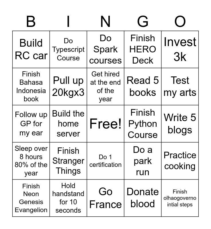 This bingo card has a free space and 24 words: Finish Stranger Things, Hold handstand for 10 seconds, Get hired at the end of the year, Finish Neon Genesis Evangelion, Invest 3k, Build RC car, Finish Bahasa Indonesia book, Do Typescript Course, Finish Python Course, Do 1 certification, Read 5 books, Follow up GP for my ear, Do a park run, Practice cooking, Pull up 20kgx3, Donate blood, Write 5 blogs, Do Spark courses, Test my arts, Build the home server, Finish olhaogoverno intial steps, Sleep over 8 hours 80% of the year, Finish HERO Deck and Go France.