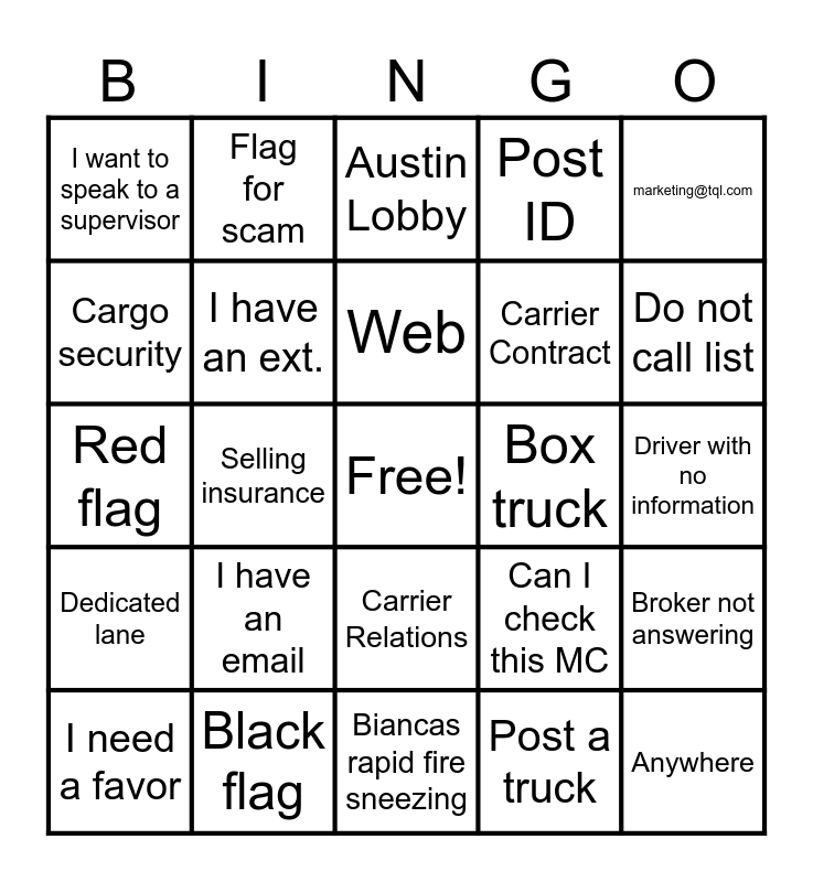 This bingo card has a free space and 29 words: I need a favor, Flatbed Hotshot, Selling insurance, Grinch comes on, I want to speak to a supervisor, Austin Lobby, I have an ext., I have an email, Box truck, Black flag, Driver with no information, Anywhere, Biancas rapid fire sneezing, Post a truck, Do not call list, Customer, Carrier Relations, Dedicated lane, marketing@tql.com, Red flag, Can I check this MC, Prospecting, Carrier Contract, Cargo security, Post ID, Flag for scam, Broker not answering, Web and PRT.