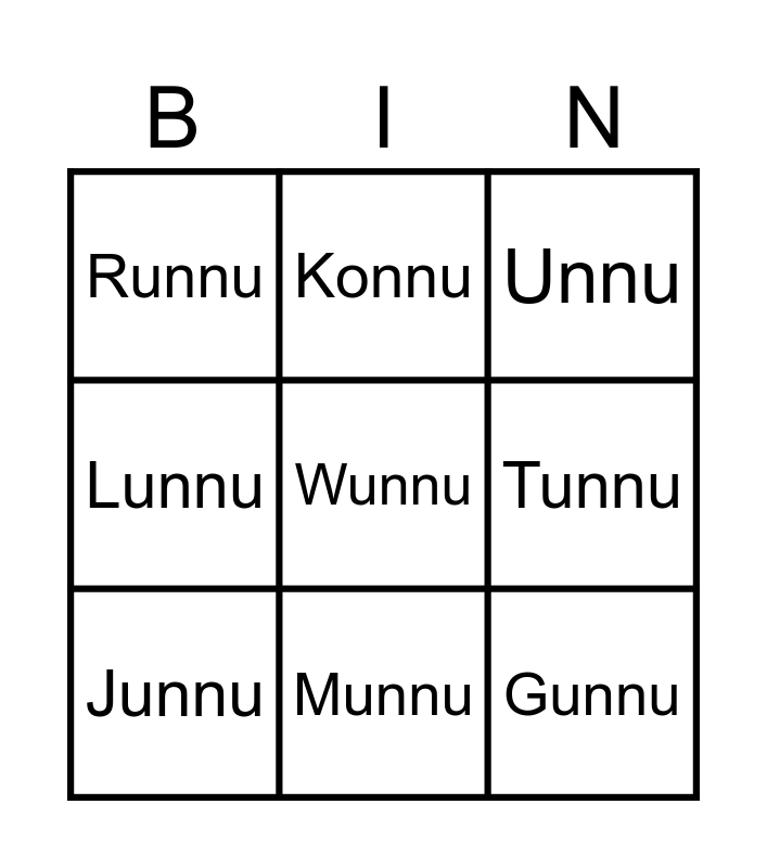 This bingo card has 12 words: Chinnu, Munnu, Gunnu, Lunnu, Konnu, Tunnu, Junnu, Nunnu, Unnu, Runnu, Wunnu and Qunnu.