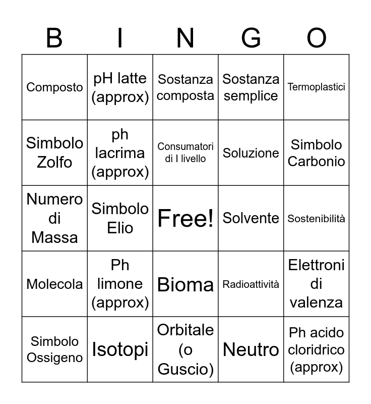 This bingo card has a free space and 90 words: Ecologia,, Ecosistema,, Bioma, Abiotico, Habitat, Nicchia ecologica, Produttori, Consumatori, Decompositori, Catena alimentare, Rete alimentare, Jane Goodall, Biodiversità, Sostenibilità, Consumatori di III livello, Consumatori di I livello, Consumatori di II livello, Atomo, Protone, Neutrone, Elettrone, Nucleo, Orbitale (o Guscio), Numero Atomico, Numero di Massa, Isotopi, Elemento chimico, Simbolo chimico, Tavola Periodica, Gruppo, Periodo, Elettroni di valenza, Legame chimico, Molecola, Composto, Sostanza semplice, Sostanza composta, Simbolo Idrogeno, Simbolo Elio, Simbolo Carbonio, Simbolo Ossigeno, Simbolo Zolfo, Metalli, Non metalli, Gas Nobili, Radioattività, Protio, Deuterio, Trizio, Miscuglio, Miscuglio Omogeneo, Soluzione, Soluzione satura, Corpo di fondo, Miscuglio Eterogeneo, Fase, Solvente, Soluto, Solubilità, Concentrazione, Emulsione, Filtrazione, Decantazione, Centrifugazione, pH, Acido, Base, Neutro, Indicatore, Phmetro, Ph limone (approx), Ph acido cloridrico (approx), Ph acido solforico (approx), Ph yogurt (approx), pH latte (approx), ph lacrima (approx), ph ammoniaca (approx), ph bicarbonato (approx), Polimero, Monomero, Plastica, Termoplastici, Termoindurenti, Elastomeri, Bioplastica, Riciclo, Polimerizzazione, Isole di plastca, Pacific trash vortex and Paperelle.