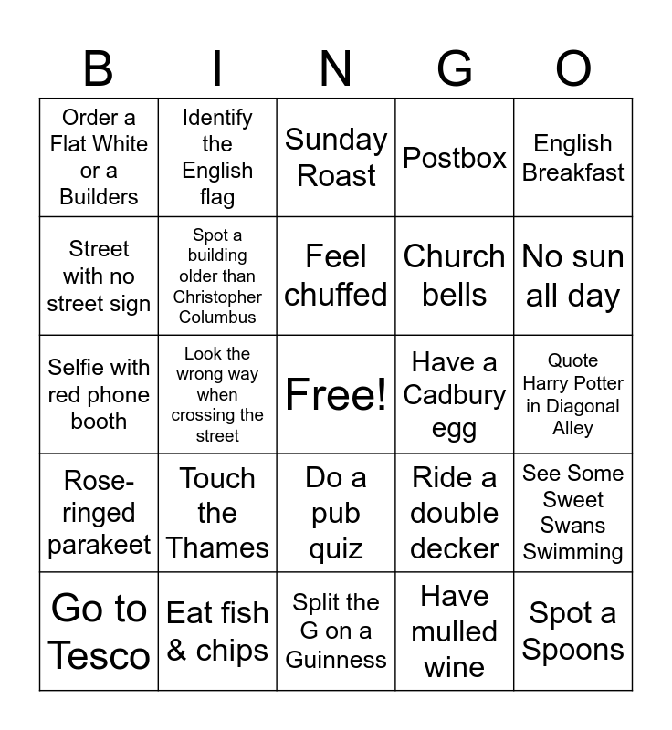 This bingo card has a free space and 30 words: Eat fish & chips, Read Queens Elizabeth’s Clock, Look the wrong way when crossing the street, Hear someone say “cheers”, Order a Flat White or a Builders, Sunday Roast, Spot a building older than Christopher Columbus, Do a pub quiz, Have a Cadbury egg, Split the G on a Guinness, Quote Harry Potter in Diagonal Alley, Spot a Spoons, Have mulled wine, Eat a biscuit, No sun all day, Horse, Ride a double decker, Rose-ringed parakeet, Touch the Thames, English Breakfast, Selfie with red phone booth, Find a British lion, Identify the English flag, Church bells, Street with no street sign, Postbox, See Some Sweet Swans Swimming, Go to Tesco, Feel chuffed and Dog off leash.