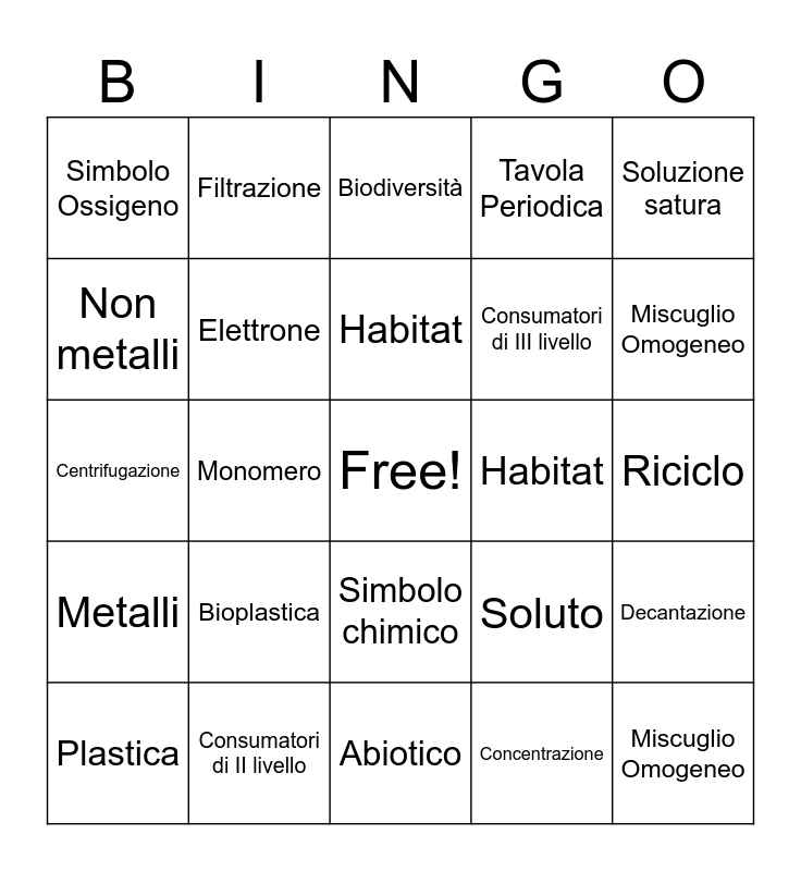 This bingo card has a free space and 177 words: Ecologia,, Ecosistema,, Bioma, Abiotico, Habitat, Nicchia ecologica, Produttori, Consumatori, Decompositori, Catena alimentare, Rete alimentare, Jane Goodall, Biodiversità, Sostenibilità, Consumatori di III livello, Consumatori di I livello, Consumatori di II livello, Atomo, Protone, Neutrone, Elettrone, Nucleo, Orbitale (o Guscio), Numero Atomico, Numero di Massa, Isotopi, Elemento chimico, Simbolo chimico, Tavola Periodica, Gruppo, Periodo, Elettroni di valenza, Legame chimico, Molecola, Composto, Sostanza semplice, Sostanza composta, Simbolo Idrogeno, Simbolo Elio, Simbolo Carbonio, Simbolo Ossigeno, Simbolo Zolfo, Metalli, Non metalli, Gas Nobili, Radioattività, Protio, Deuterio, Trizio, Miscuglio, Miscuglio Omogeneo, Soluzione, Soluzione satura, Corpo di fondo, Miscuglio Eterogeneo, Fase, Solvente, Soluto, Solubilità, Concentrazione, Emulsione, Filtrazione, Decantazione, Centrifugazione, pH, Acido, Base, Neutro, Indicatore, Phmetro, Ph limone (approx), Ph acido cloridrico (approx), Ph acido solforico (approx), Ph yogurt (approx), pH latte (approx), ph lacrima (approx), ph ammoniaca (approx), ph bicarbonato (approx), Polimero, Monomero, Plastica, Termoplastici, Termoindurenti, Elastomeri, Bioplastica, Riciclo, Polimerizzazione, Isole di plastca, Pacific trash vortex, Paperelle, Certo! Ecco la lista senza numeri:, Elettrone, ph bicarbonato (approx), Metalli, Numero Atomico, Sostanza composta, Jane Goodall, Neutro, Polimerizzazione, Bioplastica, Protone, Habitat, Riciclo, Ph acido cloridrico (approx), Bioma, Ecologia, Simbolo Zolfo, Nicchia ecologica, Pacific trash vortex, Sostanza semplice, Sostenibilità, Soluzione ph lacrima (approx), Tavola Periodica, Centrifugazione, Neutrone, Abiotico, Corpo di fondo, Plastica, Composto, Isotopi, Simbolo Carbonio, Monomero, Filtrazione, Isole di plastica, Phmetro, Polimero, Decantazione, Legame chimico, Consumatori di I livello, Atomo, Fase, Simbolo Elio, Ecosistema, Consumatori di II livello, Numero di Massa, Biodiversità, Gruppo, Base, Radioattività, Miscuglio Omogeneo, Termoindurenti, Consumatori di III livello, Simbolo chimico, Decompositori, Concentrazione, Elemento chimico, Ph yogurt (approx), Elettroni di valenza, Miscuglio Eterogeneo, Trizio, Orbitale (o Guscio), Solvente, Molecola, Ph acido solforico (approx), Paperelle ph ammoniaca (approx), Produttori, Solubilità, Simbolo Ossigeno, Deuterio, Acido, Simbolo Idrogeno, Soluzione satura, Catena alimentare, pH, Non metalli, Emulsione, Indicatore, Elastomeri, Miscuglio Gas Nobili, Nucleo, Protio, Soluto, pH latte (approx), Rete alimentare, Periodo, Consumatori and Ph limone (approx).