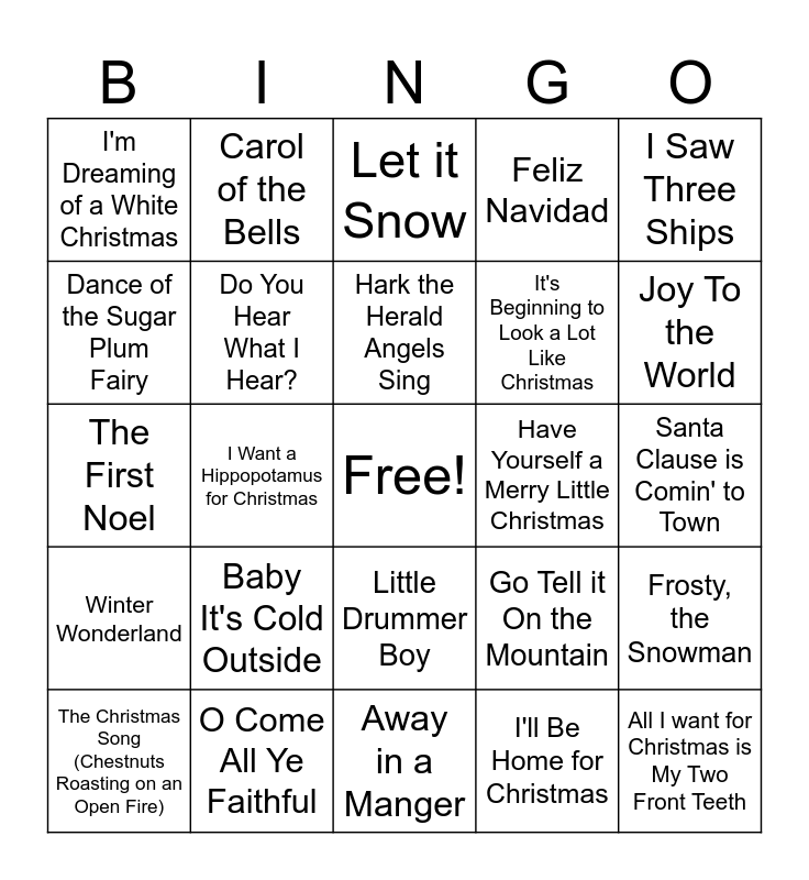 This bingo card has a free space and 50 words: A Holly Jolly Christmas, All I want for Christmas is My Two Front Teeth, All I Want for Christmas Is You, Away in a Manger, Baby It's Cold Outside, Blue Christmas, Carol of the Bells, Christmas Time is Here, Dance of the Sugar Plum Fairy, Deck the Halls, Do You Hear What I Hear?, Feliz Navidad, Frosty, the Snowman, Go Tell it On the Mountain, God Rest Ye Merry Gentlemen, Good King Wenceslas, Hark the Herald Angels Sing, Have Yourself a Merry Little Christmas, Here Comes Santa Claus, I Saw Three Ships, I Want a Hippopotamus for Christmas, I'll Be Home for Christmas, I'm Dreaming of a White Christmas, It's Beginning to Look a Lot Like Christmas, Jingle Bells, Jolly Old Saint Nicholas, Joy To the World, Last Christmas, Let it Snow, Little Drummer Boy, Little Saint Nick, Mary Did You Know, Mele Kalikimaka, O Christmas Tree, O Come All Ye Faithful, O Holy Night, Rockin' Around the Christmas Tree, Rudolph, the Red-Nosed Reindeer, Run Rudolph Run, Santa Clause is Comin' to Town, Silent Night, Sleigh Ride, Somewhere in My Memory, The Chipmunk Song, The Christmas Song (Chestnuts Roasting on an Open Fire), The First Noel, Twelve Days of Christmas, We Thring Kings, Winter Wonderland and Wonderful Christmastime.