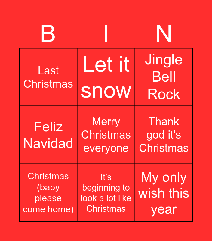 This bingo card has 18 words: All I want for christmas, Underneath the tree, Jingle Bell Rock, Last Christmas, Santa Claus is coming to town, Feliz Navidad, It’s the most wonderful time of the year, Let it snow, It’s beginning to look a lot like Christmas, My only wish this year, Santa tell me, Merry Christmas everyone, Jingle Bells, Thank god it’s Christmas, Christmas (baby please come home), Holly jolly Christmas, Rockin around the Christmas tree and Merry Xmas Everybody.