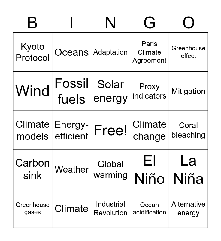 This bingo card has a free space and 24 words: Weather, Climate, Solar energy, Greenhouse gases, Greenhouse effect, Kyoto Protocol, Wind, Oceans, Climate change, Global warming, Proxy indicators, Climate models, El Niño, La Niña, Fossil fuels, Ocean acidification, Coral bleaching, Adaptation, Mitigation, Energy-efficient, Alternative energy, Carbon sink, Paris Climate Agreement and Industrial Revolution.