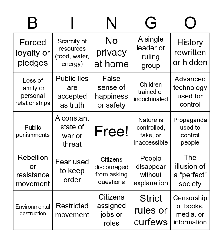This bingo card has a free space and 31 words: Citizens assigned jobs or roles, Emotions discouraged or controlled, A constant state of war or threat, Technology replacing human interaction, Forced loyalty or pledges, No privacy at home, Public lies are accepted as truth, People disappear without explanation, Nature is controlled, fake, or inaccessible, Strict rules or curfews, Propaganda used to control people, Censorship of books, media, or information, People punished for thinking differently, Uniforms or forced sameness, Advanced technology used for control, A society divided into classes, The illusion of a “perfect” society, Fear used to keep order, Rebellion or resistance movement, Citizens discouraged from asking questions, History rewritten or hidden, Limited or controlled language, Environmental destruction, Scarcity of resources (food, water, energy), Children trained or indoctrinated, Loss of family or personal relationships, A single leader or ruling group, Public punishments, Restricted movement, False sense of happiness or safety and Protagonist begins to question society.