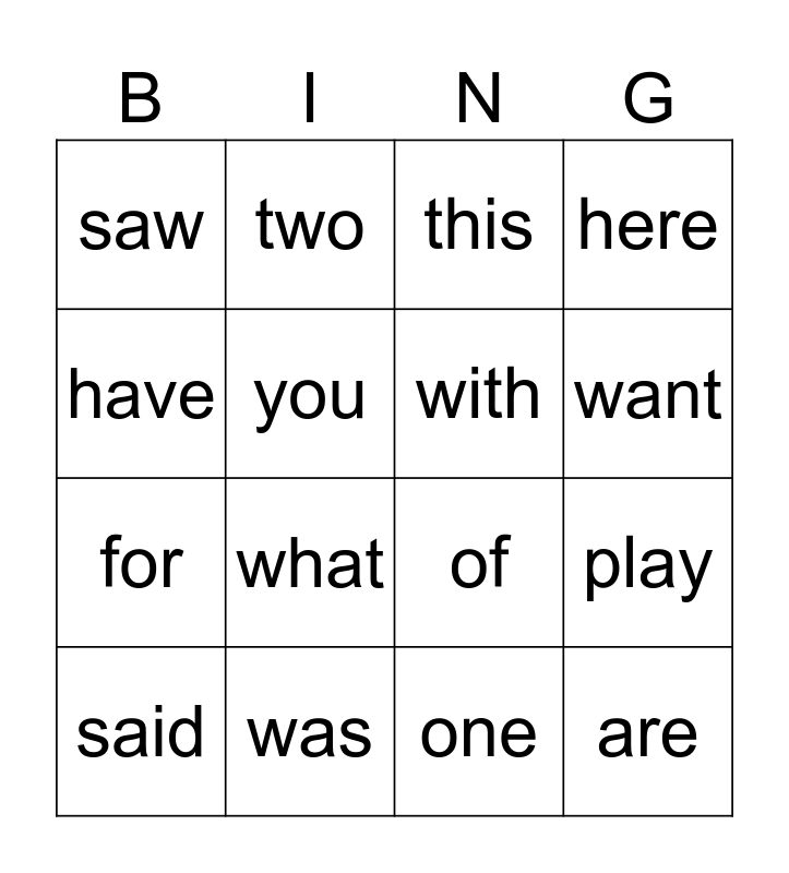 This bingo card has 18 words: what, are, this, saw, of, here, said, two, want, for, one, have, play, you, with, and, was and my.