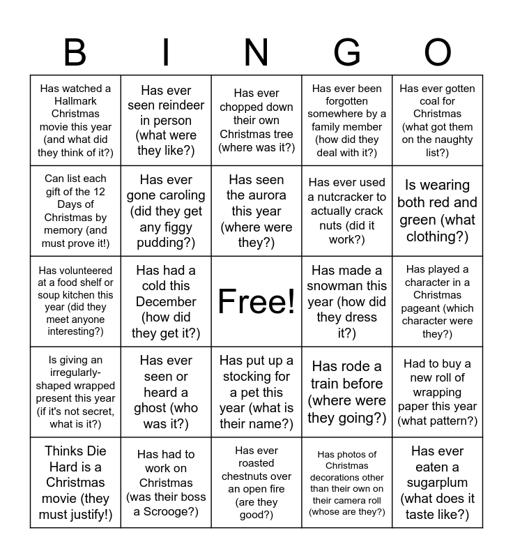 This bingo card has a free space and 73 words: Can list 10 Christmas songs (without looking them up!), Can sing the entirety of Santa Claus is Coming To Town from memory (and must prove it!), Has watched a Hallmark Christmas movie this year (and what did they think of it?), Has baked Christmas cookies this year (what kind and what shapes?), Has ever actually kissed someone under mistletoe (ask them about it!), Still has not finished their Christmas shopping (who is left?!), Is giving an irregularly-shaped wrapped present this year (if it's not secret, what is it?), Has had hot chocolate this year (how do they dress it up?), Has rode a train before (where were they going?), Has fallen off a roof (what were they doing up there?), Has ever dressed up as an elf (what was the occasion?), Can name all of Santa's reindeer from memory (and must prove it! Hint: there are 9!), Has ever gone caroling (did they get any figgy pudding?), Has played a character in a Christmas pageant (which character were they?), Has ever rode in a sleigh (how was it?), Has ever seen reindeer in person (what were they like?), Has ever roasted chestnuts over an open fire (are they good?), Can list each gift of the 12 Days of Christmas by memory (and must prove it!), Has 5 or fewer Christmas decorations up at home (what are they?), Has made a snowman this year (how did they dress it?), Has seen the aurora this year (where were they?), Has ever been forgotten somewhere by a family member (how did they deal with it?), Has ever gotten coal for Christmas (what got them on the naughty list?), Has worn an ugly Christmas sweater this year (what does it look like?), Thinks Die Hard is a Christmas movie (they must justify!), Has ever unintentionally missed Christmas due to weather and/or travel (where were they coming from?), Has been using an Advent calendar this year (what do they do each day?), Has reconnected with someone this December they had not talked to in at least five years (who was it?), Has eaten a candy cane this year (what was the occasion?), Has a special winter holiday-themed accessory (where did they get it?), Has had to work on Christmas (was their boss a Scrooge?), Has a picture in their camera roll of a pet dressed up for Christmas (they must prove it!), Has fallen on ice this year (what were they doing?), Has been ice skating, skiing, snowboarding, or sledding this year (what was the occasion?), Has had a cold this December (how did they get it?), Has participated in a Secret Santa exchange this year (what did they get?), Has a Christmas playlist on their music app of choice (what are their 3 favorites?), Has plans with friends or family for New Year's Eve (what are they doing?), Has ever eaten a sugarplum (what does it taste like?), Has ever eaten figgy pudding (what does it taste like?), Has photos of Christmas decorations other than their own on their camera roll (whose are they?), Has ever seen or heard a ghost (who was it?), Has ever seen or heard an angel (what did they say or do?), Has thrown a snowball this year (what was the occasion?), Brought a scarf today (where did they get it?), Has ever used a nutcracker to actually crack nuts (did it work?), Has ever chopped down their own Christmas tree (where was it?), Has watched a movie franchise Christmas special this year (which franchise?), Can lift you with a hug (they must prove it!), Has volunteered at a food shelf or soup kitchen this year (did they meet anyone interesting?), Has been in an ice or snow related car accident this year (where were they?), Has written a letter to Santa this year (what was at the top of the list?), Has a birthday in December (which day?), Has put up more than one Christmas tree this year (who were they for?), Has built a gingerbread house this year (what was the occasion?), Has an Elf on the Shelf at home (what have they observed this year?), Doesn't like eggnog (when did they last try it?), Has put up a stocking for a pet this year (what is their name?), Plays a winter sport (how is the season going?), Has sent a Christmas card this year (what was the big highlight?), Has received more than 5 Christmas cards this year (who from?), Can say Merry Christmas in another language without looking it up (they must prove it!), Has seen Santa at the mall this year (did they get to talk to him?), Is wearing both red and green (what clothing?), Can list 5 names for Santa from memory (they must prove it!), Remembers at least 3 verses from 'Twas the Night Before Christmas (they must prove it!), Has a mug they use only during the holidays (what is on it?), Has attended a Christmas party at work this year (anything interesting happen there?), Had to buy a new roll of wrapping paper this year (what pattern?), Has ever been frostbitten (what were they doing?), Has hand-crafted one of their gifts this year (if not secret, what is it?), Has found a deal of at least 40% on one of their gifts this year (if not secret, what is it?) and Has played a different Christmas-themed party game this year (what is it?).