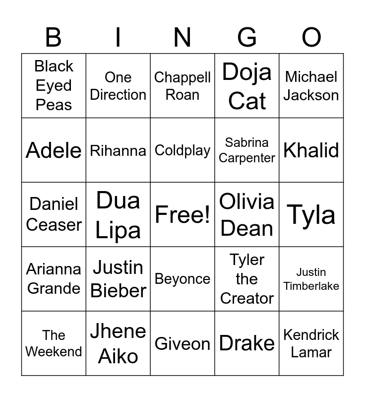 This bingo card has a free space and 29 words: The Weekend, Kehlani, Dua Lipa, Rose, Black Eyed Peas, Chappell Roan, Rihanna, Justin Bieber, Olivia Dean, Jhene Aiko, Tyla, Kendrick Lamar, Giveon, Drake, Khalid, Taylor Swift, Beyonce, Arianna Grande, Michael Jackson, Daniel Ceaser, Tyler the Creator, SZA, Sabrina Carpenter, Adele, Doja Cat, One Direction, Justin Timberlake, Coldplay and Childish Gambino.