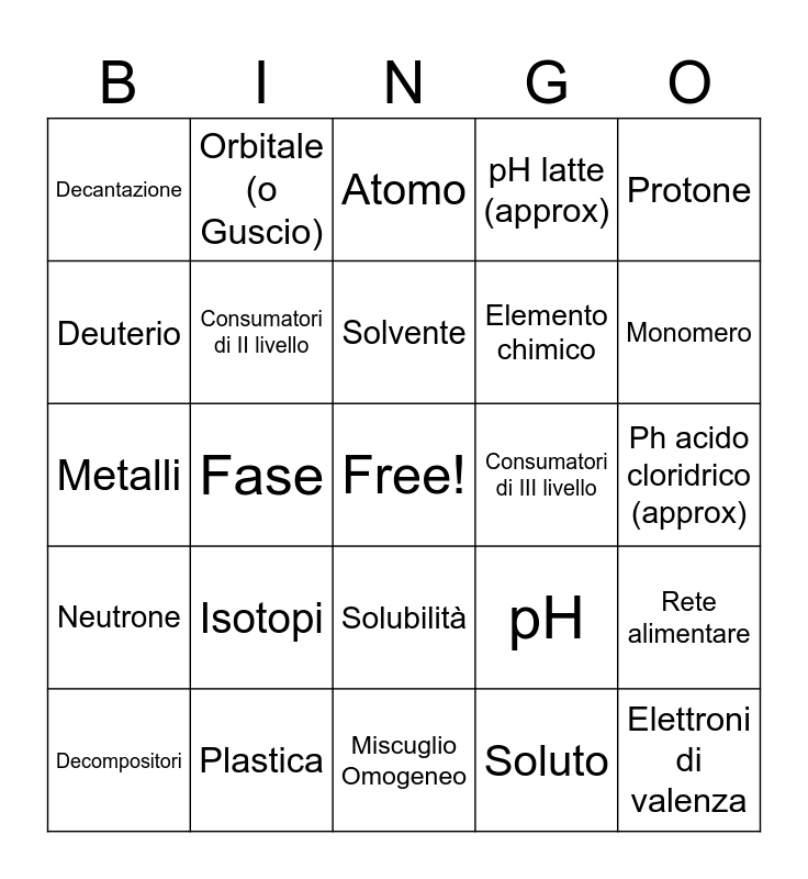 This bingo card has a free space and 83 words: Abiotico, Acido, Atomo, Base, Biodiversità, Bioma, Bioplastica, Catena alimentare, Concentrazione, Composto, Consumatori, Consumatori di I livello, Consumatori di II livello, Consumatori di III livello, Corpo di fondo, Decantazione, Decompositori, Deuterio, Ecologia, Ecosistema, Elastomeri, Elemento chimico, Elettroni di valenza, Emulsione, Fase, Filtrazione, Gruppo, Habitat, Indicatore, Isole di plastica, Isotopi, Jane Goodall, Legame chimico, Metalli, Miscuglio Eterogeneo, Miscuglio Gas Nobili, Miscuglio Omogeneo, Molecola, Monomero, Neutrone, Neutro, Nicchia ecologica, Non metalli, Nucleo, Numero Atomico, Numero di Massa, Orbitale (o Guscio), Pacific trash vortex, Paperelle ph ammoniaca (approx), Periodo, pH, pH latte (approx), Ph acido cloridrico (approx), Ph acido solforico (approx), Ph bicarbonato (approx), Ph limone (approx), Ph yogurt (approx), Phmetro, Plastica, Polimerizzazione, Polimero, Produttori, Protio, Protone, Radioattività, Rete alimentare, Riciclo, Simbolo Carbonio, Simbolo chimico, Simbolo Elio, Simbolo Idrogeno, Simbolo Ossigeno, Simbolo Zolfo, Solubilità, Soluto, Soluzione ph lacrima (approx), Soluzione satura, Solvente, Sostenibilità, Sostanza semplice, Tavola Periodica, Termoindurenti and Trizio.