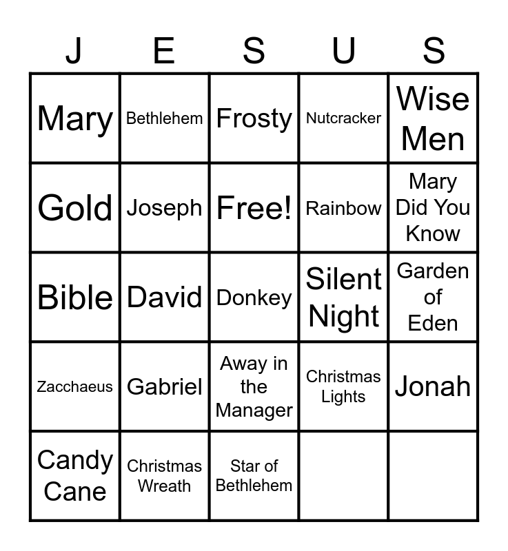 This bingo card has 26 words: Candy Cane, Christmas Wreath, Free!, Christmas Lights, Wise Men, Mary, Joseph, Frosty, Rainbow, Jonah, Bible, David, Shepherds, Silent Night, Mary Did You Know, Rudolph, Bethlehem, Away in the Manager, Nutcracker, Garden of Eden, Zacchaeus, Gabriel, Donkey, Star of Bethlehem, Gold and Poinsettia.