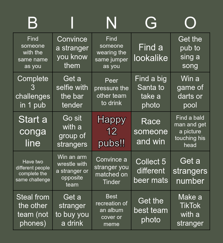 This bingo card has a free space and 24 words: Win an arm wrestle with a stranger or opposite team, Get a stranger to buy you a drink, Peer pressure the other team to drink, Steal from the other team (not phones), Get the pub to sing a song, Find someone with the same name as you, Complete 3 challenges in 1 pub, Convince a stranger you know them, Race someone and win, Convince a stranger you matched on Tinder, Find a big Santa to take a photo, Start a conga line, Collect 5 different beer mats, Get a strangers number, Get a selfie with the bar tender, Get the best team photo, Find a bald man and get a picture touching his head, Find someone wearing the same jumper as you, Win a game of darts or pool, Go sit with a group of strangers, Make a TikTok with a stranger, Have two different people complete the same challenge, Find a lookalike and Best recreation of an album cover or meme.