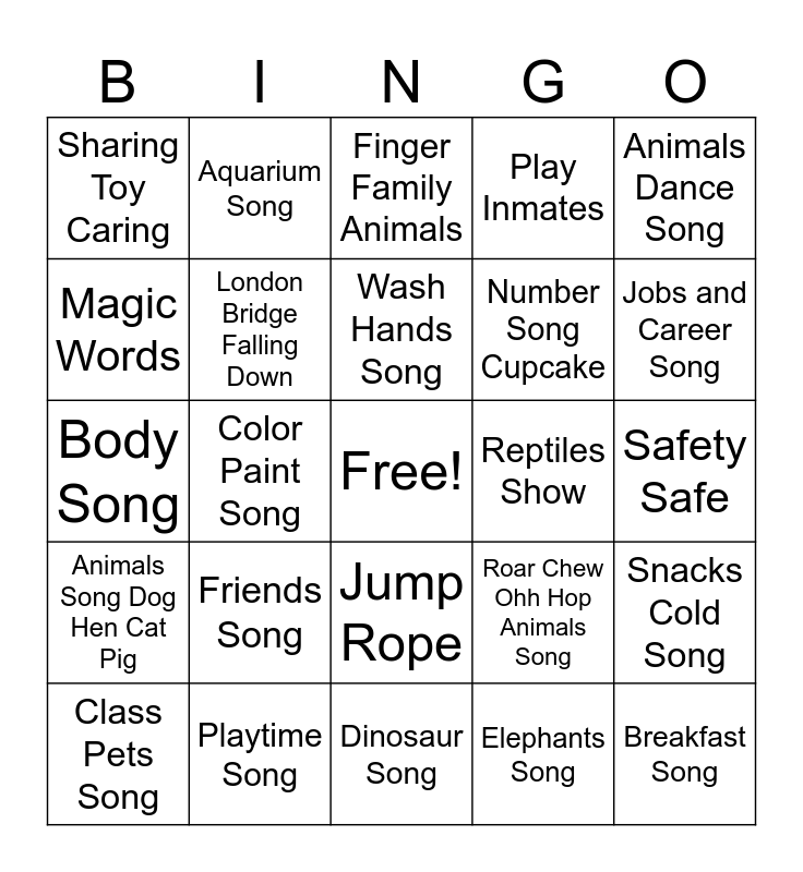 This bingo card has a free space and 44 words: First Day the School, Breakfast Song, Wheels the of bus, Class Pets Song, to Share, Elephants Song, Finger Family Animals, Dinosaur Egg Hike Song Seek Look, Animals Dance Song, Playtime Song, Play Inmates, Reptiles Show, Jump Rope, Friends Song, Sharing Caring, Dinosaur Song, |Like School, Body Song, are you Lying Baby John, Jobs and Career Song, Aquarium Song, Babies Slide are you, Excited Scared Playground Song, Sharing Toy Caring, Play Nice School, Safety Safe, Art Craft Song, Panties Song, Roar Chew Ohh Hop Animals Song, Animals Song Dog Hen Cat Pig, Five Senses, Snacks Cold Song, Babies Water Park, Swimming Pool, Color Paint Song, Playground Song Swing, Digger Song, Color Shapes Build Song, Wash Hands Song, Magic Words, Number Song Cupcake, Feelings Song, London Bridge Falling Down and Checkup Doctor Song.