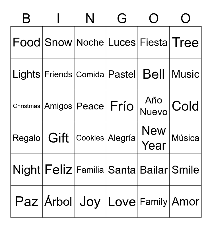 This bingo card has 46 words: Free!, Christmas, Navidad, New Year, Año Nuevo, Santa, Snow, Nieve, Tree, Árbol, Lights, Luces, Gift, Regalo, Family, Familia, Friends, Amigos, Party, Fiesta, Music, Música, Food, Comida, Cake, Pastel, Cookies, Galletas, Cold, Frío, Happy, Feliz, Love, Amor, Joy, Alegría, Peace, Paz, Dance, Bailar, Night, Noche, Bell, Campana, Smile and Sonrisa.