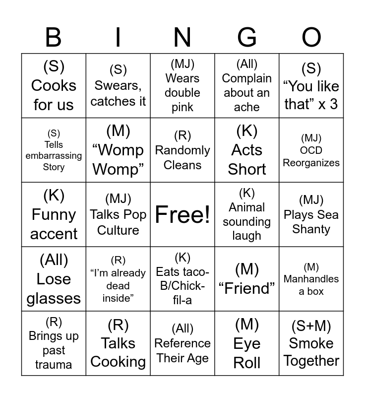This bingo card has a free space and 24 words: (R) “I’m already dead inside”, (R) Talks Cooking, (R) Randomly Cleans, (R) Brings up past trauma, (S) “You like that” x 3, (S) Cooks for us, (S) Tells embarrassing Story, (S) Swears, catches it, (K) Animal sounding laugh, (K) Eats taco-B/Chick-fil-a, (K) Acts Short, (K) Funny accent, (M) “Friend”, (M) Manhandles a box, (M) “Womp Womp”, (M) Eye Roll, (MJ) Plays Sea Shanty, (MJ) Wears double pink, (MJ) OCD Reorganizes, (MJ) Talks Pop Culture, (S+M) Smoke Together, (All) Lose glasses, (All) Complain about an ache and (All) Reference Their Age.