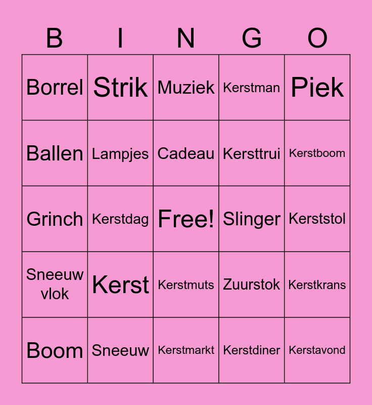 This bingo card has a free space and 24 words: Kerst, Sneeuw, Cadeau, Boom, Piek, Borrel, Ballen, Strik, Slinger, Kerstmuts, Kersttrui, Grinch, Zuurstok, Kerstkrans, Lampjes, Kerstdiner, Kerststol, Muziek, Kerstboom, Kerstdag, Kerstavond, Sneeuw vlok, Kerstman and Kerstmarkt.