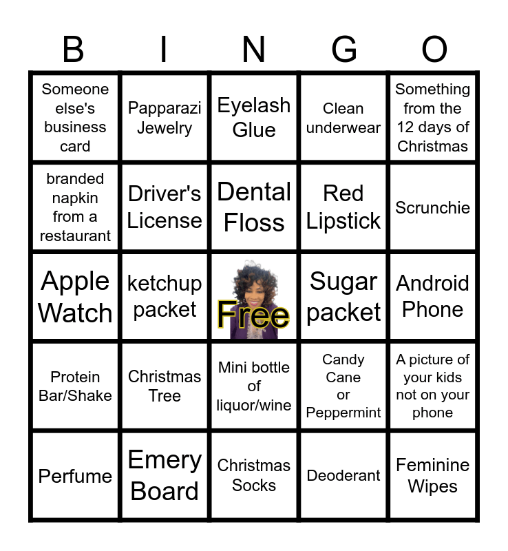 This bingo card has a free space and 24 words: Christmas Tree, Emery Board, Dental Floss, Perfume, Something from the 12 days of Christmas, Someone else's business card, branded napkin from a restaurant, Papparazi Jewelry, Sugar packet, Mini bottle of liquor/wine, Red Lipstick, Apple Watch, Candy Cane or Peppermint, A picture of your kids not on your phone, Driver's License, Deoderant, Android Phone, Eyelash Glue, Scrunchie, ketchup packet, Feminine Wipes, Protein Bar/Shake, Clean underwear and Christmas Socks.