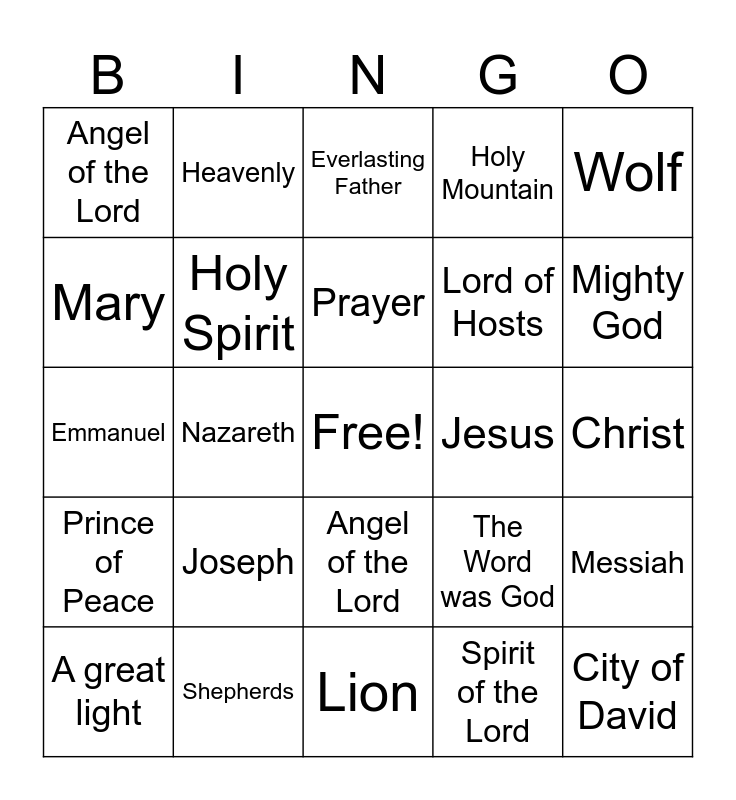 This bingo card has a free space and 35 words: onderful Counselor, Thanks be to God, In the Beginning, Holy Spirit, Angel of the Lord, Holy Mountain, Mary, God is with us, Prayer, Manger, Emmanuel, Wolf, Glory, Full of Grace, Angel of the Lord, Jesus, Spirit of the Lord, Nazareth, Prince of Peace, City of David, The Word was God, A great light, Messiah, Shepherds, Everlasting Father, Mighty God, Justice, A child has been born, Lord of Hosts, Christ, A great light, Lion, Joseph, Heavenly and Birth.