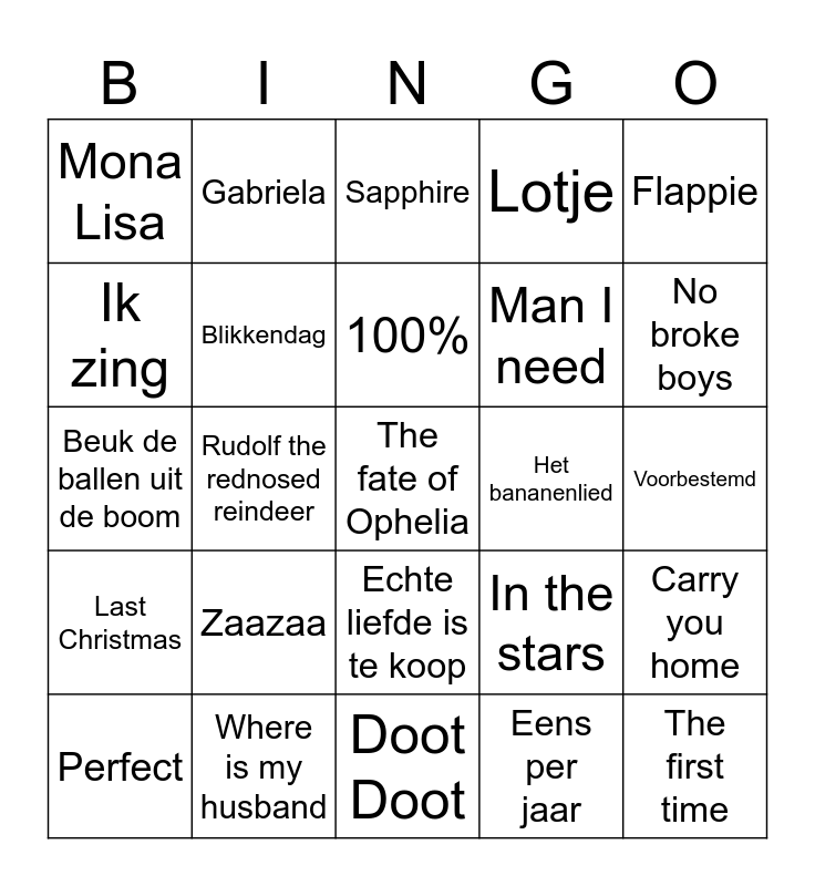 This bingo card has 35 words: Free!, All of me, Terug in de tijd, Blikkendag, Echte liefde is te koop, Lotje, Ik zing, Ik spaar geen centen, 100%, Nothing to lose, Beuk de ballen uit de boom, Flappie, Baila de gasolina, Tranquilo, Mona Lisa, Het bananenlied, Eens per jaar, Rudolf the rednosed reindeer, Last Christmas, The fate of Ophelia, In the stars, Perfect, Carry you home, Where is my husband, Sapphire, No broke boys, The first time, Golden, Man I need, Voorbestemd, Nog even blijven, Doot Doot, Zaazaa, Gabriela and Vol avontuur.