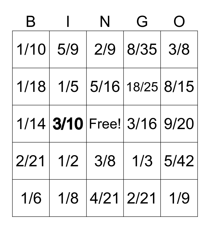 This bingo card has a free space and 24 words: 1/2, 1/8, 5/16, 1/6, 3/8, 1/10, 1/18, 5/9, 3/16, 3/8, 18/25, 1/14, 1/3, 5/42, 1/5, 2/21, 9/20, 2/9, 8/15, 3/10, 1/9, 2/21, 8/35 and 4/21.