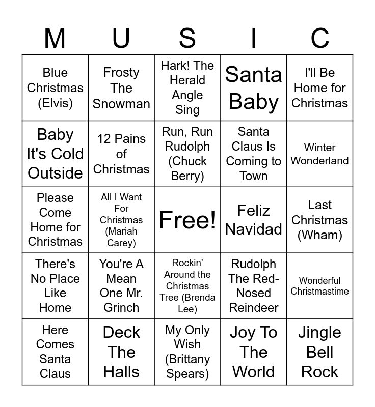 This bingo card has a free space and 24 words: You're A Mean One Mr. Grinch, Deck The Halls, Run, Run Rudolph (Chuck Berry), Here Comes Santa Claus, I'll Be Home for Christmas, Blue Christmas (Elvis), Baby It's Cold Outside, Frosty The Snowman, Feliz Navidad, Rockin' Around the Christmas Tree (Brenda Lee), Santa Claus Is Coming to Town, Please Come Home for Christmas, Rudolph The Red-Nosed Reindeer, Wonderful Christmastime, 12 Pains of Christmas, Joy To The World, Last Christmas (Wham), Hark! The Herald Angle Sing, Winter Wonderland, All I Want For Christmas (Mariah Carey), Jingle Bell Rock, There's No Place Like Home, Santa Baby and My Only Wish (Brittany Spears).