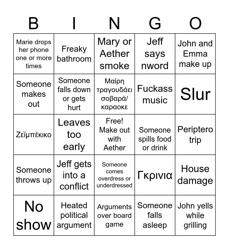 This bingo card has a free space and 29 words: No show, Arrives too late, Leaves too early, Chris and Athena freaky time, Marie drops her phone one or more times, Mary or Aether smoke, Someone falls down or gets hurt, Jeff gets into a conflict, Someone spills food or drink, Heated political argument, Periptero trip, John yells while grilling, Arguments over board game, Someone falls asleep, Slur, Someone forgets their phone, Someone comes overdress or underdressed, Someone throws up, John and Emma make up, Ζεϊμπέκικο, Γκρινια, League talk, Fuckass music, Someone makes out, Jeff says nword, Freaky bathroom, House damage, Μαίρη τραγουδάει σοβαρά/καραοκε and Gay joke between straight men.