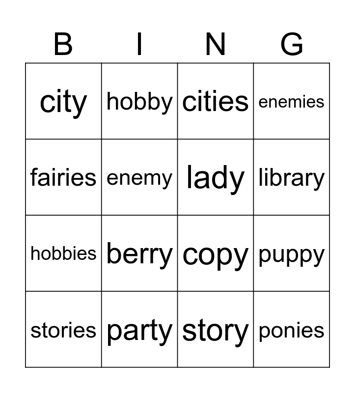 This bingo card has 30 words: baby, babies, puppy, puppies, city, cities, lady, ladies, party, parties, story, stories, family, families, berry, berries, pony, ponies, fairy, fairies, copy, copies, hobby, hobbies, enemy, enemies, cherry, cherries, library and libraries.