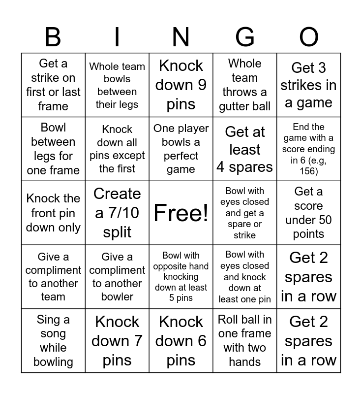 This bingo card has a free space and 29 words: Sing a song while bowling, Get a score above 100, Create a 7/10 split, Roll ball between legs and knock down at least one pin, Get a strike on first or last frame, Knock down 9 pins, Knock down all pins except the first, Give a compliment to another bowler, Bowl with eyes closed and get a spare or strike, Knock down 7 pins, Get a score under 50 points, Get 2 spares in a row, Knock down 6 pins, Roll ball in one frame with two hands, End the game with a score ending in 6 (e.g, 156), Gutter ball, Bowl with opposite hand knocking down at least 5 pins, Give a compliment to another team, Get 3 strikes in a game, Knock the front pin down only, Bowl with eyes closed and knock down at least one pin, Get two strikes in a row, Get at least 4 spares, Bowl between legs for one frame, Whole team throws a gutter ball, Whole team bowls between their legs, Get 2 spares in a row, One player bowls a perfect game and One member bowls a turkey (3 strikes in a row).
