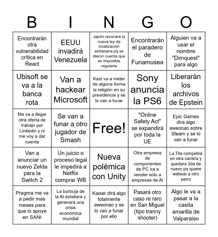This bingo card has a free space and 24 words: Un juicio o proceso legal le impedirá a Netflix comprar WB, La burbuja de la AI estallará y generará una crisis económica mundial, Kast va a meter de alguna forma la religión en su presidencia y se lo van a funar, Pragma me va a pedir mas meses para que lo apoye en SANI, Alguien va a usar el nombre "Dimquest" para algo, Encontrarán otra vulnerabilidad crítica en React, Ubisoft se va a la banca rota, EEUU invadirá Venezuela, "Online Safety Act" se expandirá por toda la UE, Nueva polémica con Unity, Sony anuncia la PS6, Me va a llegar otra oferta de trabajo por Linkedin y ni me voy a dar cuenta, Otra empresa de componentes de PC ira a vender solo a empresas de AI, La Tita competirá en otra carrera y quedara 2da de nuevo pq quiere webear a otro perro, Van a hackear Microsoft, Pasará otro caso re raro en San Miguel (tipo tranny shooter), Epic Games dira algo aweonao sobre Steam y se lo van a funar, Japón revocará la nueva ley de localización extranjera pq se dieron cuenta que es imposible regularla, Liberarán los archivos de Epstein, Se van a funar a otro jugador de Smash, Algo le va a pasar a la casita amarilla de Valparaiso, Van a anunciar un nuevo Zelda para la Switch 2, Encontrarán el paradero de Funamusea and Kaiser dirá algo totalmente aweonao y se lo van a funar por ello.